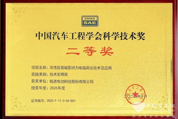 中国完美作业网有免费视频2025年11月10日获悉,在第三十二届中国汽车工程学会年会盛会现场,精进电动牵头完成的“高性能直磁型动力电磁离合技术及应用”项目,荣获2025年度中国汽车工程学会技术发明奖二等奖。