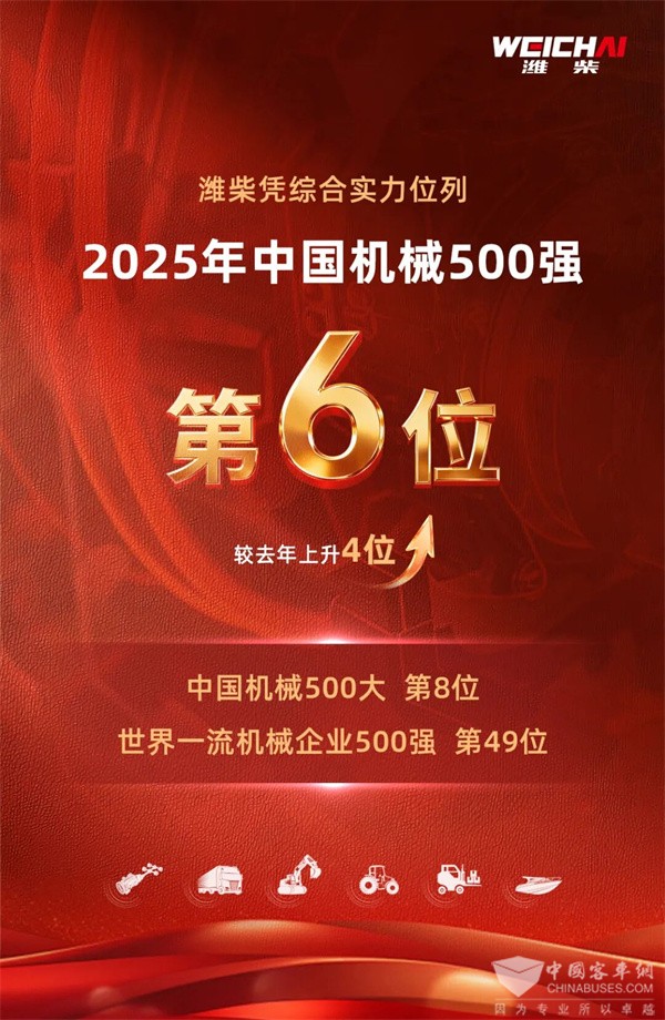 2025年12月4日,由中国机械工业企业管理协会主办的2025年中国机械500强研究报告发布会暨中机企协业务总部启用仪式在江苏举办,潍柴凭综合实力位列“2025年中国机械500强”第6位,较去年上升4位;同时位列“2025中国机械500大”第8位、“2025世界一流机械企业”第49位,以多维优异表现彰显装备制造领军企业硬核实力。