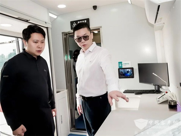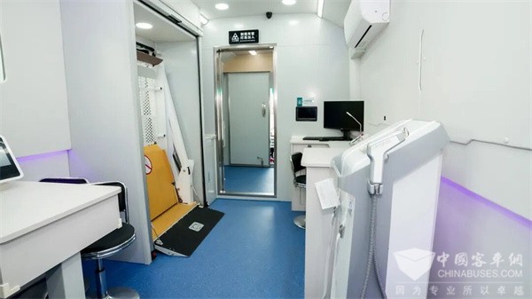同时,车辆配备了智能中控一体化系统,通过触摸屏即可全局操控环境照明、空调、消毒及通讯等子系统,还可进行语音交互控制,极大提升了医疗团队的工作效率与操作便捷性。这使其不仅能完成常规检查与初步诊断,更能现场开展应急治疗与康复指导。该车辆也搭载了通达电气通道灯、风道、踏步灯、发光防护栏等自研产品,定制化空间布局设计,也极大提升了车辆美观性和适用性。