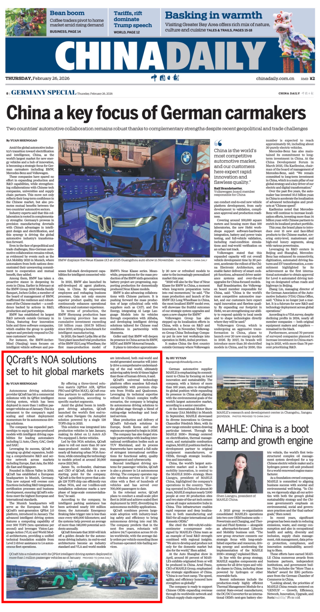 2026年2月26日,德国总理默茨访华之际,CHINADAILY(中国日报)特别刊发《中德特刊》:向世界勾勒中德两国在智能驾驶、汽车制造和经贸领域的深度合作,展现了双方优势互补与创新共赢的伙伴关系。在此关键节点,轻舟智航的名字出现在报道重要版面中。这并非偶然——百万量产达成,欧洲总部落地.……轻舟智航正成为中国智驾出海浪潮中,不容忽视的一股力量。