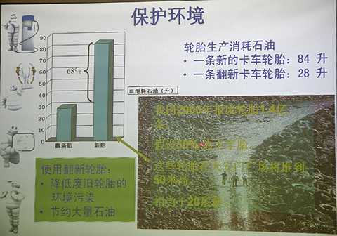 - 大量减少石油消耗。因为轮胎生产消耗石油,生产一条新的卡车轮胎平均消耗石油84升,而翻新一条卡车轮胎平均消耗石油28升