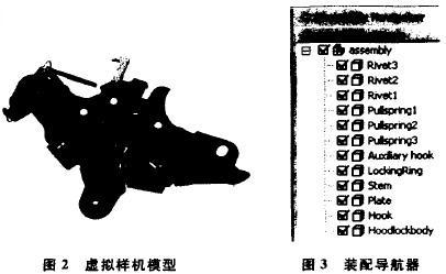应用UG软件的虚拟装配模块建立汽车发动机盖锁的虚拟样机模型。完成发动机盖锁的各个部件的虚拟样机模型的建立后,就可以进行虚拟装配了。本文采用自底向上的方法进行虚拟装配,使用配对约束、对齐约束、正交约束、角度约束、平行约束、中心对齐约束、距离约束等约束条件建立配对条件,这样一旦部件的虚拟样机模型改变,产品的虚拟装配模型即汽车发动机盖锁的虚拟样机模型将随着改变,实现了真正意义的参数化设计。汽车发动机盖锁的虚拟样机模型即总装配效果图和装配导航器如图2和3所示。