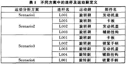 UG的Motion模块具有强大的运动仿真及分析功能,形象的运动模拟很好地体现了虚拟样机技术在设计中的运用。运动模拟仿真的全过程大致可以分为以下几个步骤:创建连杆、建立运动付、定义运动驱动、创建运动模拟仿真四个步骤。本文所研究的卡板锁的运动方式如下:发动机盖板由开启位置落下撞到辅助挂钩,此时盖板所带有的势能在锁钩撞击辅助挂钩时全部转化为动能,从而使锁钩能顶开辅助挂钩形成第一重锁止。但此时,锁钩所具有的动能还不足以推动卡板带动它一起运动。这时候就需要人用手用力的按住发动机盖往下运动直到锁构进入第二重锁止位置为止;最后人手松开,锁紧手柄在回位弹簧作用下回到初始位置并封住卡板回位的趋势。为了方便研究和分析,本文建立了四个运动分析方案scenario1、scenario2、scenario3、scenario4。在四个运动方案中,所定义的连杆及运动付如表1所示。在不同的方案中,发动机盖锁中各个部件的运动主要是以旋转为主,所以应分别为发动机盖、卡板、辅助挂钩及锁紧手柄加上旋转付,并在运动付上施加恒定驱动为运动函数。当创建好连杆、运动付,定义好运动驱动之后,就可以创建运动模拟仿真了。本文采用关节运动的方式来模拟机构的运动。关节运动分析的优点在于可以同时使多个运动付运动,并且每一个运动付所给定的步数和步长可以不同。