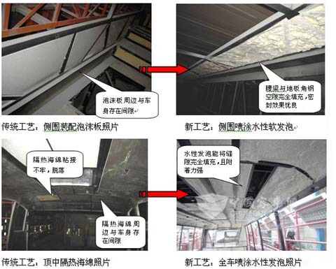水性发泡秉承普通聚氨酯发泡的优点,具有良好的填充性,能与被喷涂表面完全合为一体,可以将车身蒙皮与型钢之间的缝隙、空洞等完全密封,加之其本身所具有的保温隔热、阻气、防潮及憎水功能,保证了侧围、车顶等隔热、保温、密封、防腐性能,见下图。而其它传统隔热材料,如隔热海绵、泡沫板、复合隔热材料施工完全由人工进行,对车身蒙皮及型钢框存在间隙(见下图),即使采用带背胶的材料,车身蒙皮内表面的形状、清洁、平整状况对粘接牢固性影响颇大,施工质量无从保证。由于传统隔热材料装配后与车身存在的缝隙、空洞对车身隔热、减振、防腐等性能均有不同程度的负面影响,不能完全发挥材料本身的性能指标。