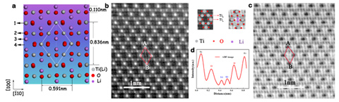 图1.(a)尖晶石Li4Ti5O12的晶格结构示意图,垂直方向为[110],1,2,3和4分别对应16d,32e,8a和16c晶格位置.(b)和(c)为Li4Ti5O12的球差校正暗场和亮场照片.(d)衬度反转的线衬度示意图,沿AB方向,其上方为放大的局部照片和原子结构示意图。