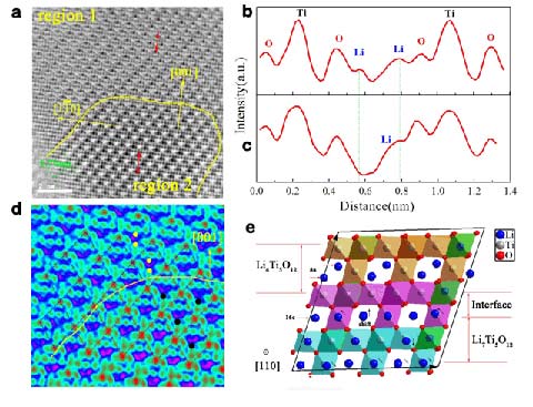 图2.化学锂化的Li4+xTi5O12(x≈0.15)两相界面结构示意图。(a)电镜亮场照片,黄线为两相界面,带轴为[110]。(b)和(c)分别对应a图中两个区域的线衬度示意图。(d)彩色的两相(Li4Ti5O12相(region1)andLi7Ti5O12相(region2))界面示意图。(e)第一性原理计算模拟的两相界面示意图,在Li4相中8aLi位置保持不变,但是在Li7相中16c位置的Li在界面附近发生了明显的偏移,和电镜结果一致。
