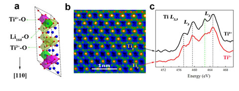 图3.Ti-L2,3原子分辨的电子能量损失谱.(a)第一性原理计算显示的不同化学状态Ti的分布示意图。(b)彩色暗场锂化的Li4Ti5O12电镜照片。(c)Ti-L2,3原子分辨的电子能量损失谱,显示锂化后的样品中的电荷非均匀分布。