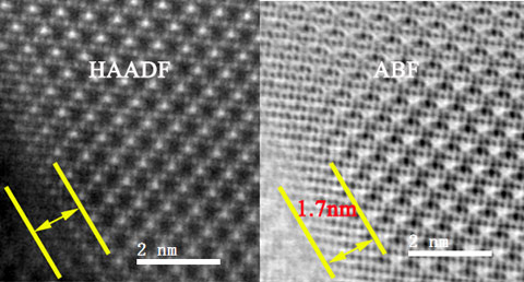 图4.放大的Li4Ti5O12暗场和亮场电镜照片。可以明显看出表面显示1-2纳米厚度的不同于体相的结构,这可能是导致该材料在实际应用时胀气的原因。