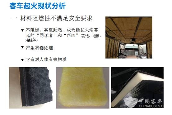 为什么这样的材料我们国内还用的这么多,不言自明,由于价格原因低质量的材料应用在客车上,使得乘客本身的安全不能得到保证。就目前执行现有标准,对于客车内饰材料的阻燃性要求非常之低,后面有一些关于标准的说明,缺乏监督和惩罚机制。我刚才谈到质量标准,目前对机动车内饰材料,只有两个国家标准有要求,一个是GB7258—2012,对于驾驶室和乘员内饰材料燃烧速度要求每分钟70毫米,这个标准非常低了,不适用大容量内饰材料的标准,一旦发生着火以后这个是非常不适用的。还有一个GB8410—2006,要求发动机舱的隔热材料燃烧速率每分钟为零。