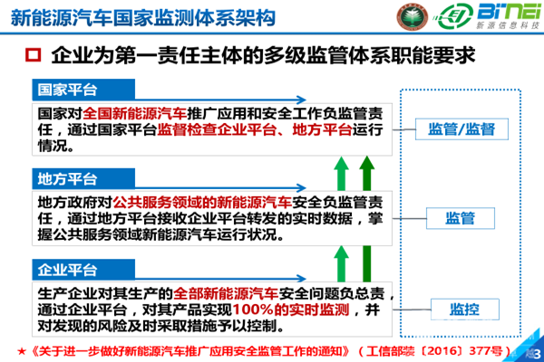 对于企业平台功能要求来说,要求更多一点,需从车辆的生产、管理一直到销售到运营,以及到最后的电池、车辆的报废和回收,是要求全寿命的跟踪和管理,其中还包括后续的电池梯次利用等等,能够在整个生态链环境当中真正发挥新能源汽车节能环保的技术优势。所以,从整个监管体系,它的平台只是技术的载体,更多的是在基于平台技术手段之上的完整的管理体系。