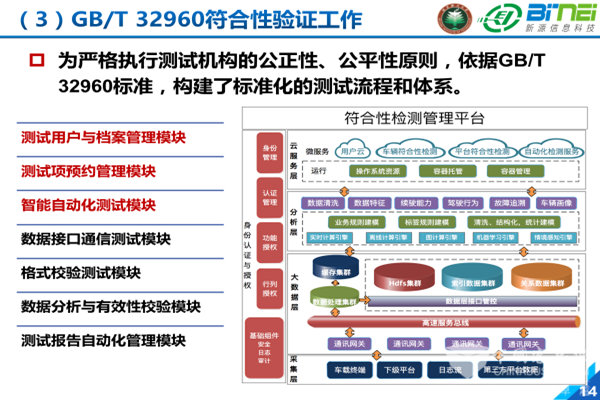 第三个就是GB/T 32960的符合性测试。从北理工来说,开展符合性测试工作的时候,一直遵循的原则就是尽量能够远程的测试,来保证整个测试过程中的节约性,同时给企业带来一些便利。所以在整个系统的架构里面基本上都是以在线预约,远程测试的模式。如何去实现远程的测试?我们也开发了自动化测试后台,以及前端的智能化测试APP。在测试过程当中只需要测试人员开着车、拿着手机,打开APP,按照APP所指示的步骤,逐步操作,最后测试完成,结束提交,这样几个层面来减少大家的交流成本。因为所有的车型在新的测试过程当中,它基本都是样车,所有的车都拉到现场去做测试,其实成本和代价都相对比较高,按照APP方式测试,试验场里面就可以把相关的一些工作能够做到位。