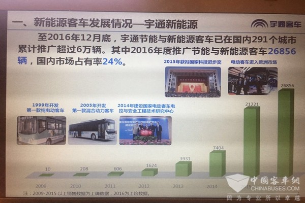 本次报告的题目是“电动客车安全性能关键技术开发及法规的测试评价”,主要有四个方面。第一个方面,首先给大家简单介绍一下宇通新能源客车最新的发展情况。截止到2016年底,国家节能与新能源客车总体推广22万辆,推广范围覆盖了我国各个省自治区直辖市,推广规模全球第一,2016年度推广总数超过了10万辆的客车,这是宇通自1997年上市以来实现了快速发展,复合增长率达到26%。2016年实现销量是70988辆的客车。在新能源客车方面,2016年底,宇通节能新能源客车在全国有291个城市推广应用总数超过6万辆,其中2016年度节能新能源客车推广了26856辆,国内市场占有率24%。2014年成立了国家电动客车安全工程技术研究中心。2015年我们推广的节能新能源客项目获得了2015年度整个汽车行业唯一整车企业的国家科技进步奖。2016年宇通电动客车进入欧洲市场,在法国巴黎等城市进行示范运行。在新能源客车方面主要技术创新围绕着电机、电池、感知等关键技术,开发安全可靠经济的新能源客车,目标是要实现提高续时里程、延长电池寿命,降低事故率。另外,宇通电动客车通过感知实现了自动驾驶。在具体技术方面,宇通客车突破了整车控制与节能技术,开发了高效动力系统,解决了关键零部件依赖进口集成录低成本高的难题,节能水平达到国际领先。其中,宇通客车发明的集成式控制器,高压节点相对原来的分布式的控制器减少了50%。成本降低了43%,功率密度达到18.4千Kw/L。