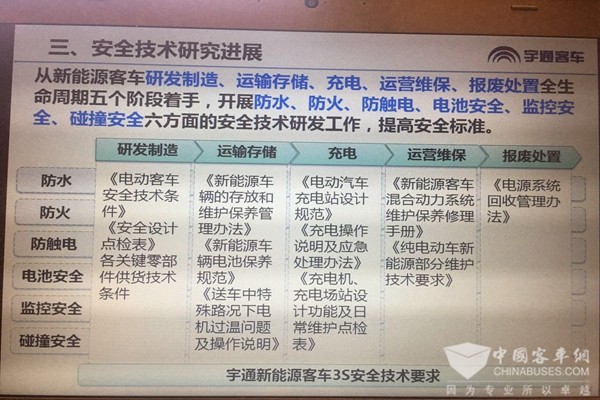 通过上面安全技术的研究,宇通客车跟中国汽车技术研究中心以及客车行业的整车企业、研究单位共同制定了电动客车安全技术条件。该安全技术条件出台背景首先是在政策的支持下,电动客车已经大规模推广,在市场上运行的电动客车的量已经很多,为节能减排做出了很大的贡献,同时也存在很多的安全风险。标准主要制定的原则,首先就是以安全标准为依据,不以技术路线为依据;另外要充分考虑现在的国际标准传统客车和电动汽车的相关标准,并且借鉴了上海北京等地方标准,吸纳企业产品的研发和企业的标准的经验,从人员触电火灾防护事故处理乘客逃生整车的结构远程监控等方面综合考虑,在现有标准体系基础上提高安全要求。标准中综合考虑了动力电池的单体模块系统的安全要求,对安全隐患较高的国标行标没有涉及到的单体热失控和系统热扩散提出了要求。该文件现在已经以管理文件的形式进行发布,相应的国家标准也正在制定。谢谢大家!