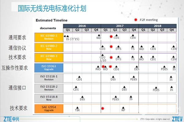目前无线充电国际标准大概是两个组织在制定,ISO是国际标准化组织,和IEC虽然是不同的国际标准,但事实是同一批人,每个组织制定自己的一系列标准,然后两个标准合在一起,会展现出一个相对比较完整的标准体系。中国的国标也是两大组织牵头,中汽研还有中电联,各自负责一个模块,跟电相关的主要是中电联牵头,和车相关的部件和内容由中汽研负责。两个组织联合来制定的这样的一个标准。在国际上基本上中汽研、中电联和中兴代表中国区参与国际标准的制定,鉴于中国第一大新能源汽车大国的地位,国际上来自中国的声音也非常重视。在国际标准和中国国标发布之前,为了有效配合各地提前部署的无线充电线路,中兴也牵头做了一些地标,包括深圳、广东、上海、成都等地,提前应用实践,给国标制定提供了参考和借鉴。