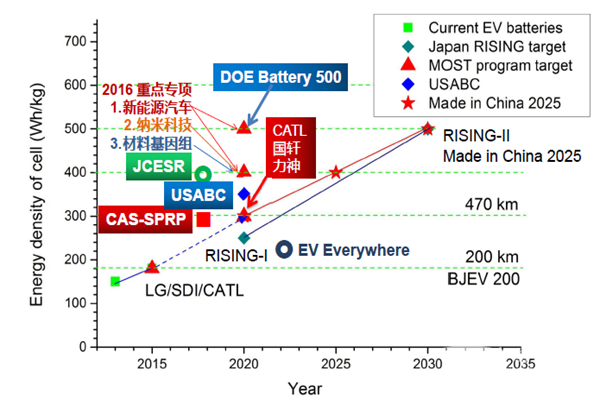 中国科学院在2013年11月布局了一个战略先导项目,希望能基于纳米技术,研究开发一些能够实际应用的先进材料和电池技术,目标是300 Wh/kg,明年6月份所有的材料要进入到量产的阶段。