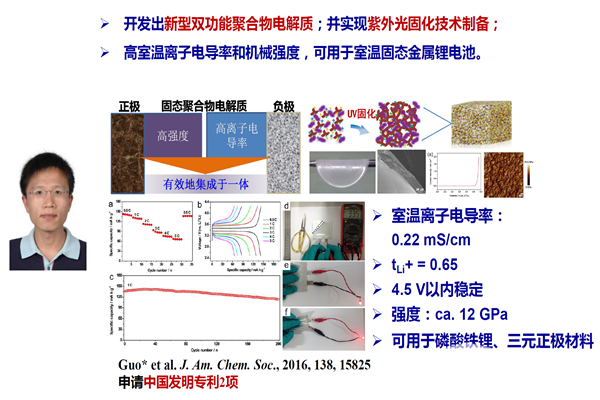在固态电池开发方面,5个团队取得了进展。化学所的郭玉国团队开发了聚(醚-丙烯酸酯)的聚合物固体电解质,耐受氧化电压是4.5伏。