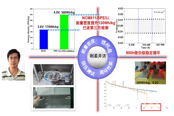 基于刚柔并济的设计思想,青岛生物能源所的崔光磊团队开发了聚丙烯碳酸酯、纤维素、锂镧锆氧复合的固体电解质,研发的电池能量密度达到了300Wh/kg,并首次在马里亚纳海沟完成了深海测试。
