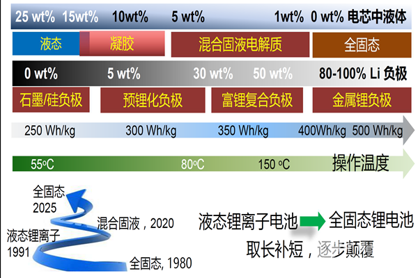 目前开发生产的液态电解质锂离子电池的软包电芯中,一般液体电解质重量百分比为20-25%,负极为碳、硅等。从长远看,未来需要发展全固态金属锂电池,负极全部为锂,但面临很大的挑战。在未来短期和中期,介于全固态和液态电解质锂离子电池之间的技术,如混合固液电解质电池,可能会在提升能量密度的同时,兼顾安全性、倍率特性、循环性,首先实现商业化。