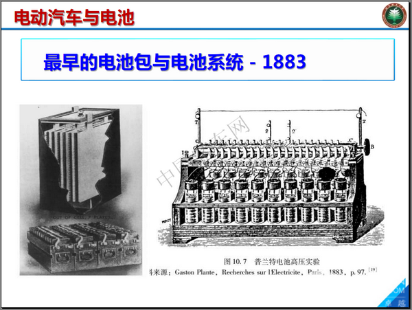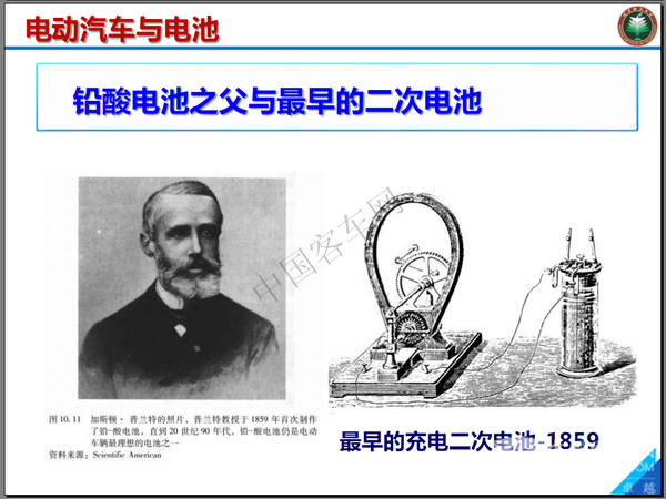 1859年法国著名物理学家、发明家普兰特(GastonPlanté)研发了世界上第一块铅酸蓄电池,从而使蓄电池开始为今后汽车的用电创造了条件,因此该项发明被人们称之为“意义深远的发明”。铅酸蓄电池自发明后,直到20世纪90年代,仍是电动车辆最理想的电池之一。