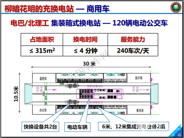 因此,孙逢春教授提倡充电站要小型化。比如集装箱式的充换电站,几百平米的充电站就解决原来是5000平米建站需求,奥运会5000平米的充换电现在在315平米就解决掉,我国出口波兰的就是集装箱模式。现在120平米的换电站可以服务120辆电动出租车,1000私家车。
