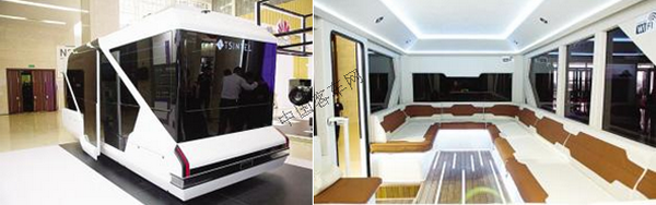 目前的设计运行时速可以达到20公里每小时,续航里程可以达到60公里,能够乘坐8-10个人,能识别和判定车辆前方50米、180度范围内的行人、车辆、障碍物。在内饰设计方面,考虑到乘客的舒适度,真皮环形座椅可以让乘客保持面对面,方便商务洽谈。
