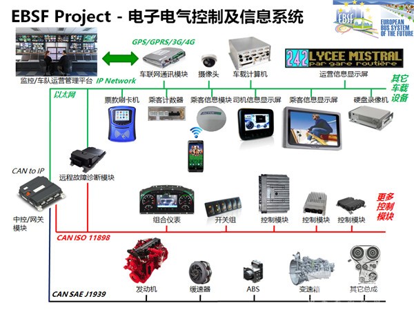 首先在欧盟范围里最重要的项目就是在2008~2012年实施的EBSF项目,它的中文名称就叫做欧洲未来公交系统项目。在EBSF里,从整车电子电气信息化领域的标志性的事件就是把工业以太网引入到了车载局域网里面来,在车上实现了工业以太网,或者车载以太网和CAN总线局域网的融合,就是所谓的共存和互相协作,这是EBSF在整车信息化上面非常重要的标志性事件。