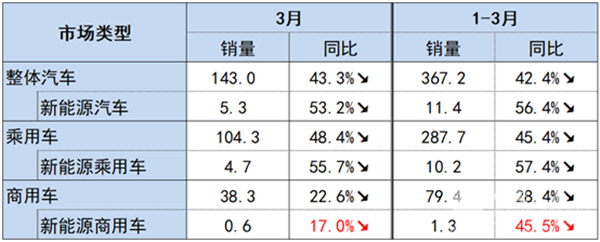 据中国汽车工业协会统计(表1),今年1-3月,我国新能源汽车销量11.4万辆,同比下降56.4%,其中新能源乘用车下滑57.4%,新能源商用车下滑45.5%。但就3月而言,新能源汽车销量5.3万辆,其中乘用车销售4.7万辆,商用车销量0.6万辆,同比下降17%。与整体汽车市场及其他细分市场相比较,新能源商用车3月对比整体Q1降幅急剧收窄,成为整个汽车市场上反弹力度最大者。这表明,新能源商用车市场出现了较大的复苏迹象。