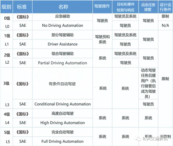 总体而言,《国标》与《SAE J3016地面车辆推荐实践(SURFACE VEHICLE RECOMMENDED PRACTICE):道路机动车辆驾驶自动化系统相关术语的分类和定义(Taxonomy and Definitions for Terms Related to Driving AutomationSystems for On-Road Motor Vehicles)》(以下简称:《SAE驾驶自动化分级》)在思路上基本一致,《国标》参照了《SAE驾驶自动化分级》中6个级别的分级框架,并结合中国当前实际情况进行了调整。例如3级/L3级及以上都由人类接管转为自动驾驶系统执行。但在0级-2级(L0-L2级)上,SAE J3016标准要求完全由人类司机进行操作,而国标则将0级自动驾驶定义为“应急辅助”,并且注明0级驾驶自动化不是无驾驶自动化:“不具备目标和事件探测与响应的能力的功能(如:定速巡航、电子稳定性控制等)不在驾驶自动化考虑的范围内。” 中国标准则定义为由自动驾驶系统和人类共同操作。另外,“3级驾驶自动化“中明确增加了对驾驶员接管能力监测和风险减缓策略的要求,明确最低安全要求,减少实际应用安全风险。