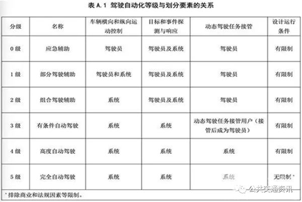 《国标》规定的0级-5级自动驾驶分类,《国标》以自动驾驶系统能够执行的动态驾驶任务的程度为区分,根据在执行自动驾驶任务过程中自动驾驶系统与驾驶员(安全员)参与驾驶控制主次为范围,将自动驾驶划分为了0级至5级,共6个等级的驾驶自动化,也为公交车驾驶的自动化发展提供了可靠的参照标准。公共交通企业是车辆的最终用户,车辆定制化生产的比例较大,通过学习《国标》,也是为自动驾驶时代的到来所必须做的准备内容之一。基于这个观点,《国标》中的0级-3级自动驾驶系统对公交行业是具有一定的现实意义。