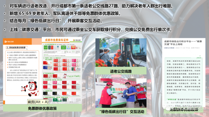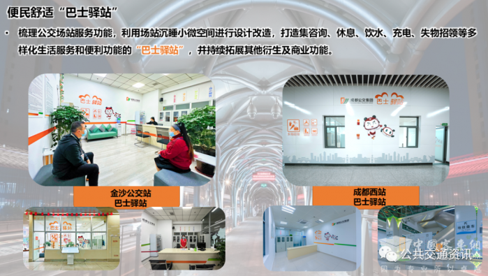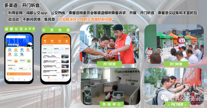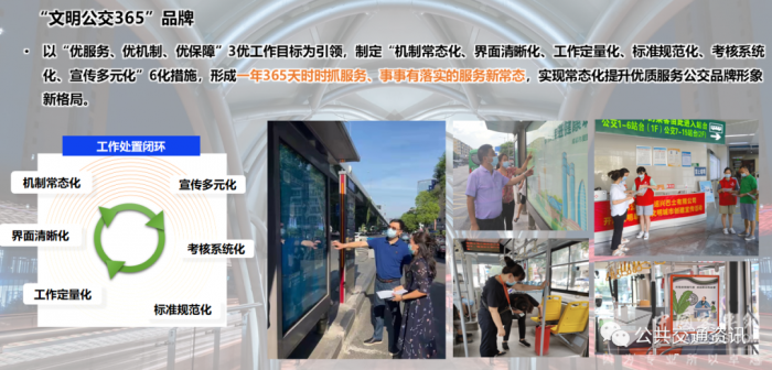成都公交围绕营运组织、线网优化、站点设置、服务提质、设施保障、场站及站厅管理、应急处置,制定客运管理标准106项,形成“用标准规范服务、靠服务完善标准,用标准规范管理、靠管理细化标准”;我们全力打造“文明公交365”品牌,形成了一年365天时时抓服务、事事有落实的服务新常态,实现了常态化提升优质服务公交品牌形象新格局;推进便民舒适“巴士驿站”,利用场站沉睡小微空间,优化场站服务功能,并持续拓展其他衍生及商业功能;对公交车进行适老改造,开行成都市第一条适老公交线路27路,助力解决老年人群出行难题;常态化地开展“开门听音”活动,多渠道倾听乘客诉求,不断问民情、集民意,满足人民群众对美好出行的向往;着力提升团队凝聚力,通过改善工作环境、开展技能大赛、建设驾驶员评估系统、企业文化室等举措,关心关爱职工,汇聚推动集团改革创新发展的强大活力。