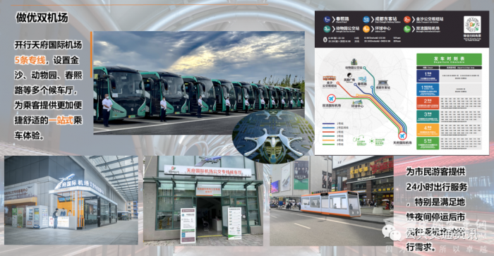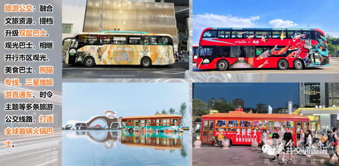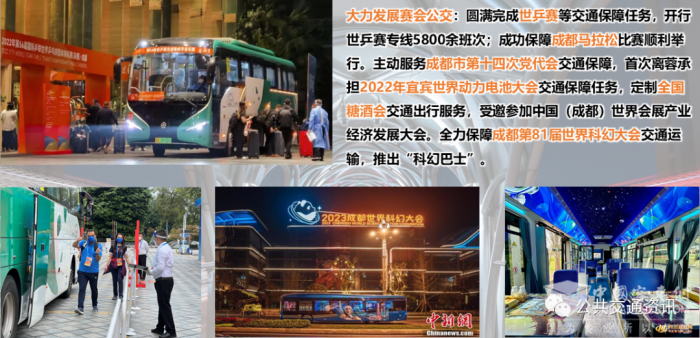成都公交围绕群众出行急难愁盼,聚焦“八连”等系列线路开行、车辆配置和安全服务标准,做到民有所呼、我必有应,为市民提供更加安全优质的出行服务。开行天府国际机场5条专线,设置金沙、动物园、春熙路等多个候车厅,为乘客提供更加便捷舒适的一站式乘车体验;拓展赛事交通服务,圆满完成成都第31届世界大学生夏季运动会、世乒赛等交通运输保障任务,主动服务成都市第十四次党代会交通保障,承担2022年宜宾世界动力电池大会交通保障任务,定制全国糖酒会交通出行服务,参加中国(成都)世界会展产业经济发展大会,全力保障成都第81届世界科幻大会交通运输并推出“科幻巴士”;大力发展旅游公交,提档升级双层巴士、观光巴士,相继开行市区观光、美食巴士、熊猫专线、三星堆旅游直通车、时令主题等多条旅游公交线路,打造全球首辆火锅巴士,开行通学巴士、铃停巴士、适老专线等定制线路百余条,满足市民个性化出行需求。