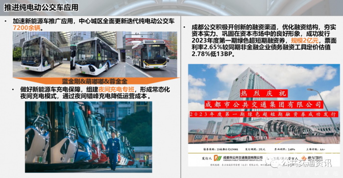 我们坚持“三精三前置”理念,按照“营运前置、运维前置、经营前置”的原则,加快了车辆的更新迭代,推进绿色发展。实现成都市中心“5+1”区域及四川天府新区在营车辆100%电动化;做好新能源车充电保障,组建夜间充电专班,形成常态化夜间充电模式,通过夜间错峰充电降低运营成本;积极拓展融资渠道,优化融资结构,夯实资本实力,建立巩固成都公交在资本市场的良好形象;建立健全新能源车辆维保体系,完善车辆修程修制,建成运维驿站、微驿站60余个,实现自管场站运维服务全覆盖,靠前维保占比近90%。