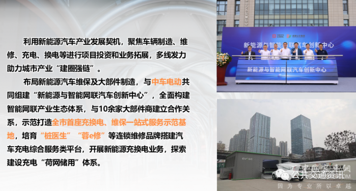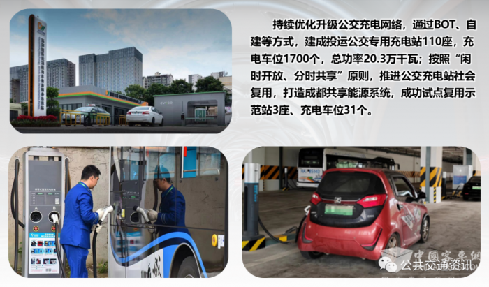 利用新能源汽车产业发展契机,聚焦车辆制造、维修、充电、换电等进行项目投资和业务拓展,多线发力助力城市产业建圈强链。与川发展合作重组蜀都客车厂,共建链主企业,招引新能源车大部件供应商,打造新能源商用车产业集群。重组下属隆星公司,布局新能源汽车维保及大部件制造,与10余家大部件商建立合作关系,示范打造全市首座充换电、维保一站式服务示范基地,培育“桩医生”“蓉e修”等连锁维修品牌。加快布局新能源充电产业,与蜀电集团、成都交投成立合资公司,共同搭建汽车充电综合服务类平台,开展新能源充换电业务,探索建设充电“荷网储用”体系;与成都特来电公司合作,持续优化升级公交充电网络,通过BOT、自建等方式,建成投运公交专用充电站110座;按照“闲时开放、分时共享”原则,推进公交充电站社会复用,打造成都共享能源系统,成功试点复用示范站3座、充电车位31个。