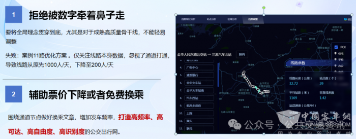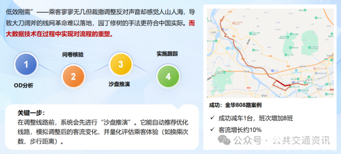 但遗憾的是,手术刀样式巴塞罗那并不适合中国。我们面临的情况更加复杂,“低效刚需”——乘客寥寥无几但裁撤调整反对声音却感觉人山人海,导致线网优化举步维艰。我们2018年金华公交做了类似的课题,并向上提交行动方案,但石沉大海。“线网革命”需要一个强有力的推动者,巴塞的成功很大一个原因是推动他是市长本人。那么无法进行手术刀式的大刀阔斧,只能转向园丁修树式的更新。当然,相较于2012年,我们有更锋利武器:在大数据、算法。答案是数据导向再造流程。以往摸黑调整、先调后改,转变为利用现有的数据平台,对OD进行分析,根据线路百公里营收、客流等关键因素,提出优化方案。继而通过问卷、跟车等进行核验。在调整线路前,系统会先进行“沙盘推演”。它能自动推荐优化线路,模拟调整后的客流变化,并量化评估乘客体验(如换乘次数、步行距离)。一方面,数据让线网优化的更加精准,一方面系统仿真让线网优化容错更高。比如成功案例808路优化方案
