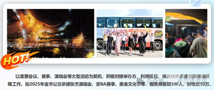 【接住泼天流量,行走的GDP】。以重要会议、赛事、演唱会等大型活动为契机,积极对接举办方,利用区位、体量优势承接交通运输保障工作。如2025年金华公交承接张杰演唱会、浙BA赛事、味美金华美食文化节等,服务乘客超10W人,创收近50万。3. 算法公交(以网约公交为例)