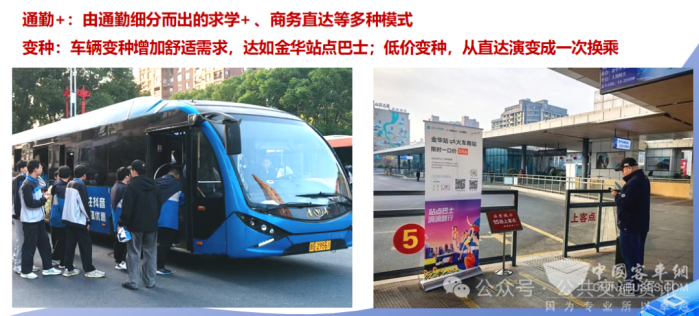 变种1:换乘的低价定制公交。通过换乘实现低价定制,如金华建校定制公交换乘至BRT。变种2 :通过将公交改为微巴提供舒适出行,如金华的站点巴士。