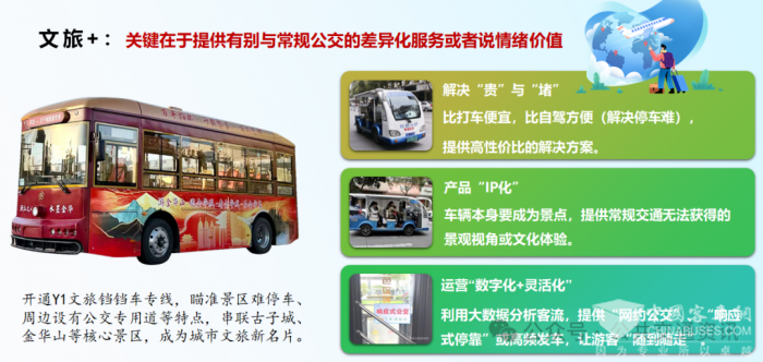 一是文旅公交。文旅公交是公交+ 衍生,关键在于提供差异化的服务,较高的情绪价值。a. 解决“贵”与“堵”:比打车便宜,比自驾方便(解决停车难)。b. 产品“IP化”: 车辆本身要成为景点,提供常规交通无法获得的景观视角或文化体验。c. 运营“数字化+灵活化”:文旅公交是最适应网公交的土壤,关键是让出行更急自由。