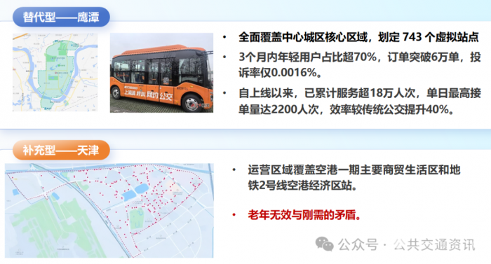 但,需要警惕的是不能被数据牵着逼走,尤其是对于公交而言老客市场效益严重,对待干调整尤其要谨慎。 不能只盯着局部,要将全局理念贯穿到底,不能被数据牵着鼻子走。失败:案例11路优化方案 ;再比如B5路和326的整合优化,骨干线吸收支线的典型案例。同时,为了降低阻力围绕通道节点做好换乘文章,增加发车频率,辅以票价下调或免费换乘。2021年,金华公充分吸收杭州经验,实施“一线一策”战略,年均优化调整线路超过45条。当然这方面,金华是后进,各位前辈都有先进经验,我就不展开。2. 不断探索“多元运营”多样化运营市场本质是细分市场,打破公交原有的模式,实现出行的个性化服务。这一块我想说的是金华有探索,摸过黑,走过弯路,结合我们实际,给出一些意见或者建议: