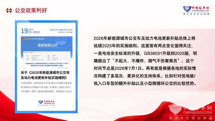 政策频道主编李洋指出,补贴政策的两大变化值得行业内部关注,一是电池安全标准大幅升级,GB38031-2025版将于2026年7月1日实施,明确提出“不起火、不爆炸、烟气不伤害乘员”的严格要求,让出行更安全;二是构建多层次差异化支持体系,低地板/低入口车型能拿额外补贴,小型微循环公交的优势一下子凸显出来。
