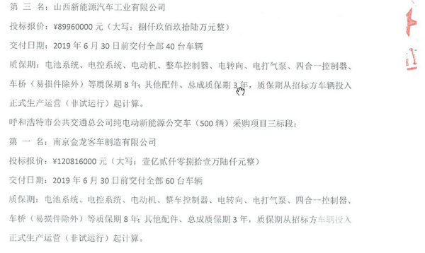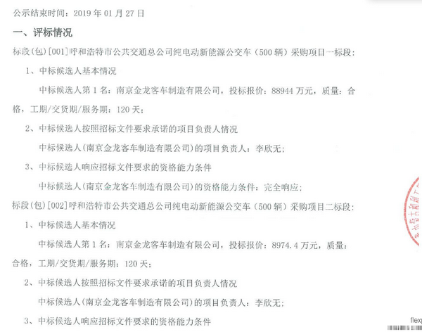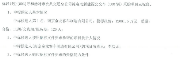 南京金龙中标呼和浩特市公共交通总公司500辆纯电动公交车采购项目