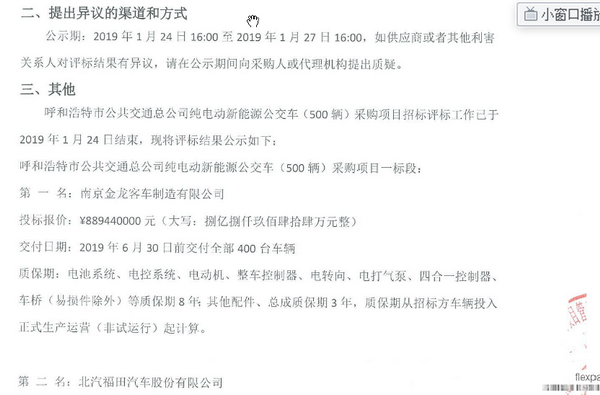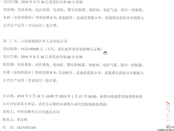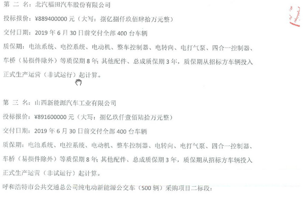 内蒙古呼和浩特市公共交通总公司500辆纯电动公交车采购项目中标候选人公示