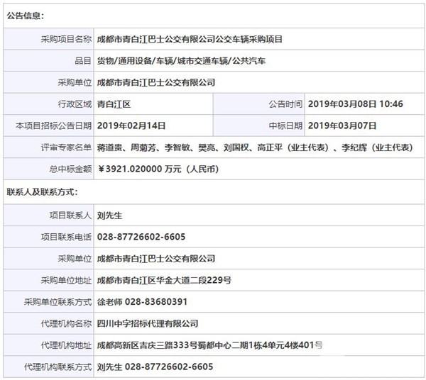 成都市青白江巴士公交有限公司公交车辆采购项目中标公告