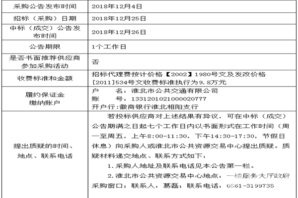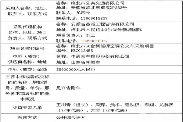安徽省淮北市50台新能源空调公交车采购项目 中标(成交)公告