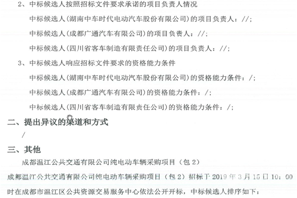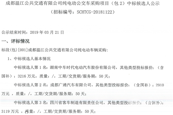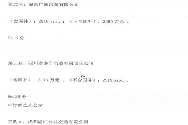成都温江公交公司关于纯电动公交车采购项目(包2)中标候选人公示
