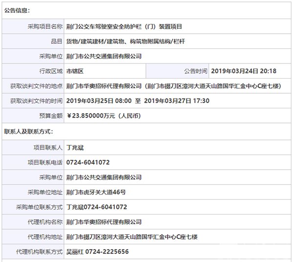 荆门市公共交通集团有限公司荆门公交车驾驶室安全防护栏(门)装置项目公告概要: