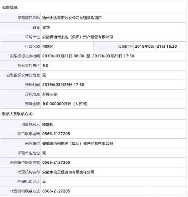 安徽省池州杰达青阳公交公司车辆采购项目A包SHDL2019-021A招标公告