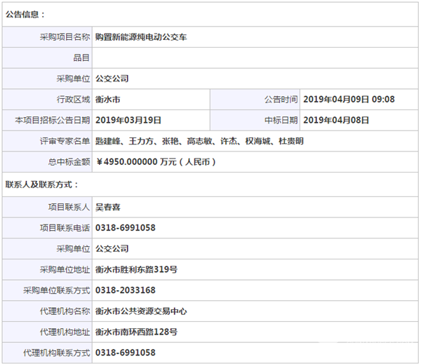 衡水市公共交通总公司8米级纯电动新能源公交车采购项目公开招标中标公告