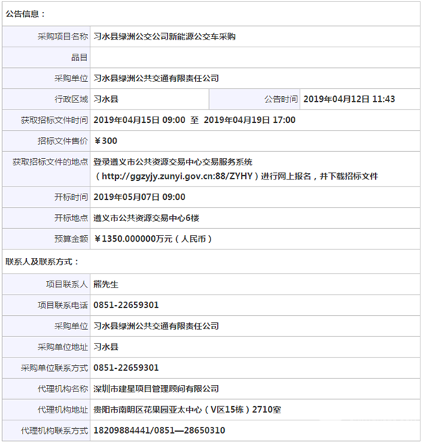 贵州省习水县绿洲公交公司新能源公交车采购公告