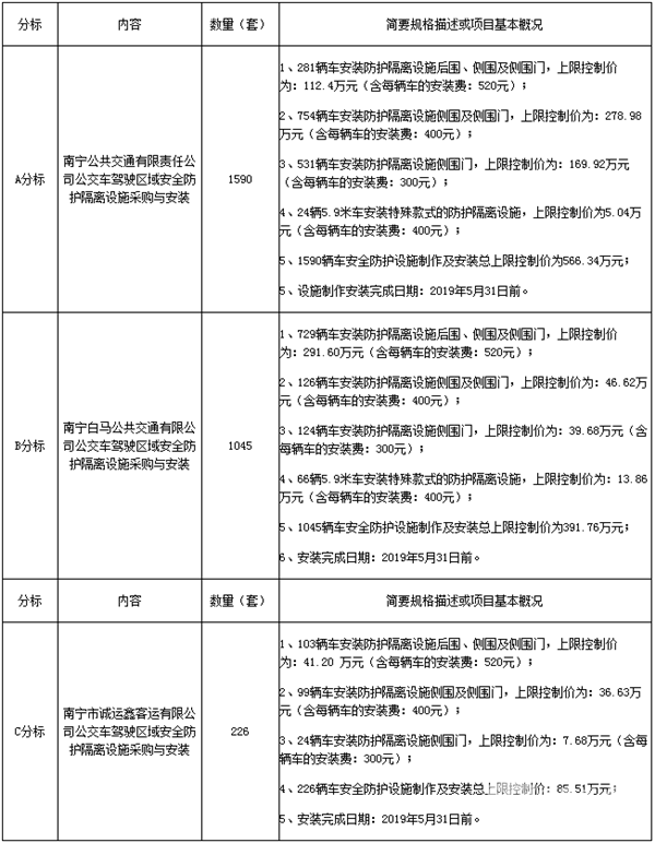 广西科文招标有限公司受采购单位南宁公共交通有限责任公司、南宁白马公共交通有限公司、南宁市诚运鑫客运有限公司共同委托,拟对公交车驾驶区域安全防护隔离设施采购与安装进行国内公开招标,诚邀贵单位参加投标。为便于参加投标,现将有关事项通知如下: