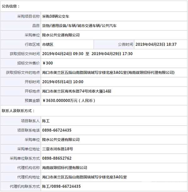 海南省陵水公共交通有限公司采购38辆公交车公开招标公告
